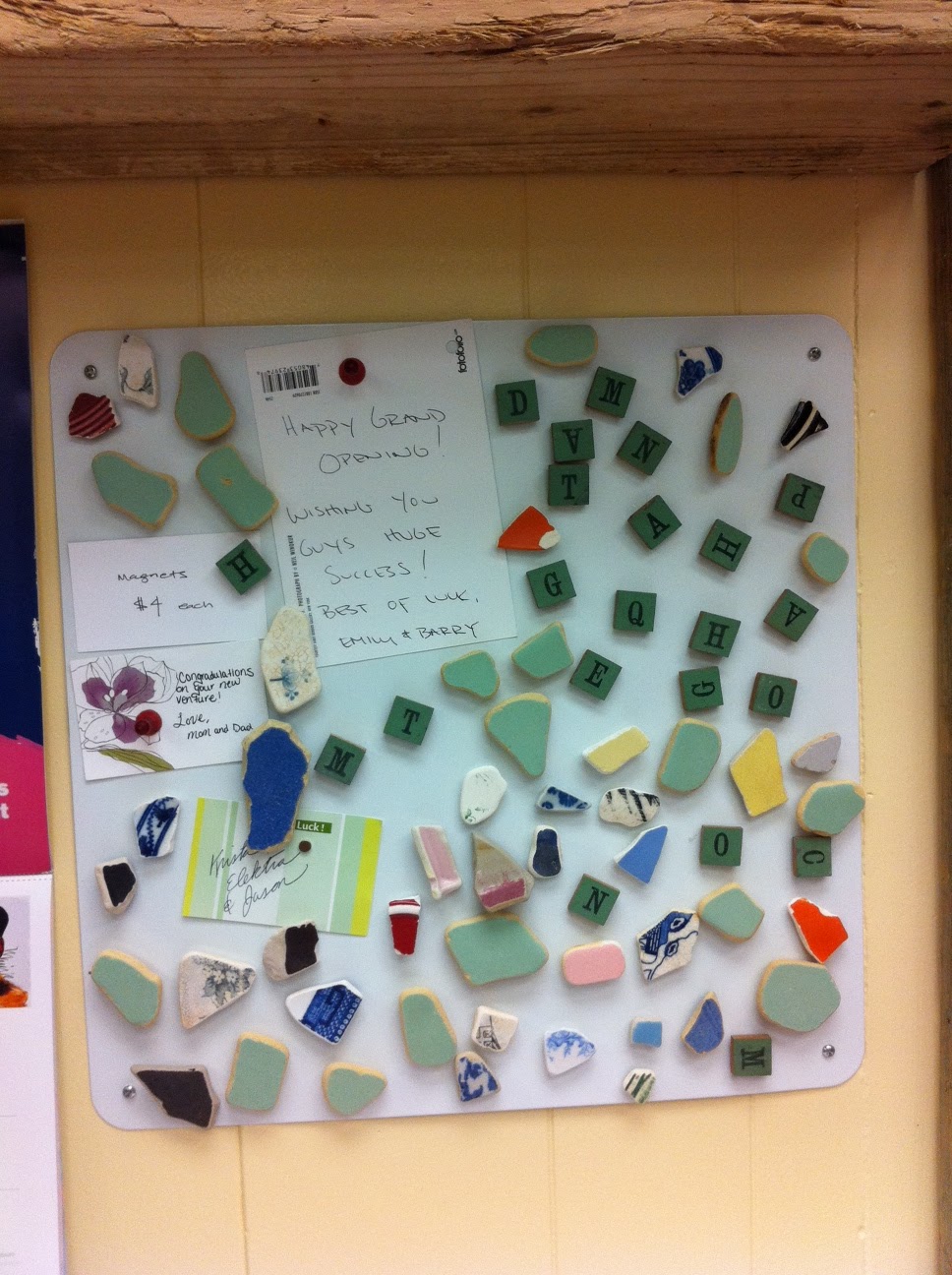 Sea tiles are close to sea glass, but made out of random pieces of tile or dishes that we found on the beach.